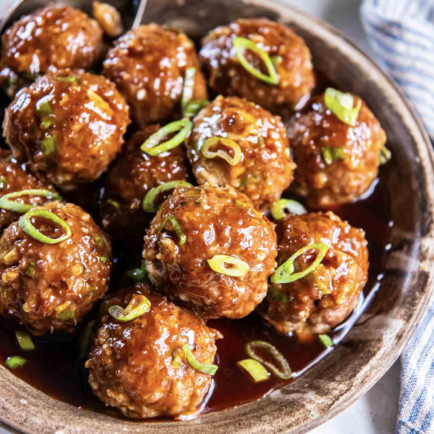 Boulettes de viande aigres-douces d'inspiration asiatique | Sauce soja | Gingembre | Mirin | Vinaigre de riz | Purée de pommes de terre crémeuse à l'ail | Carottes au sésame, miel et gingembre